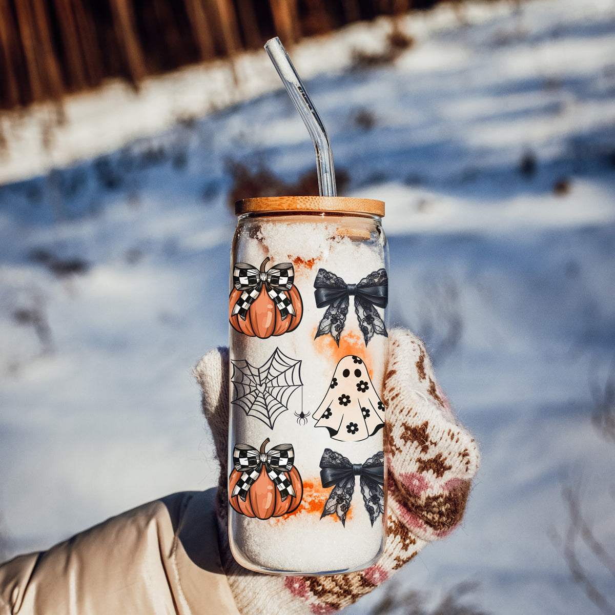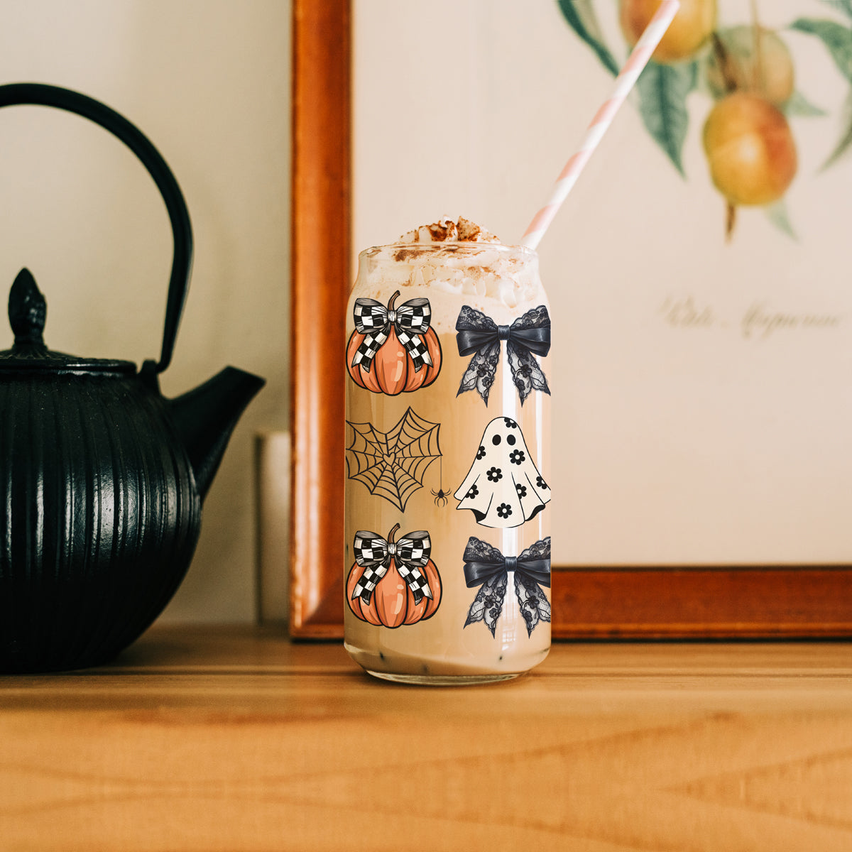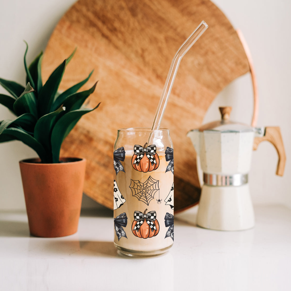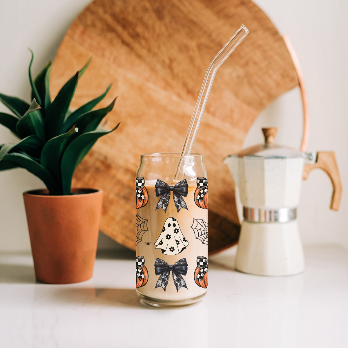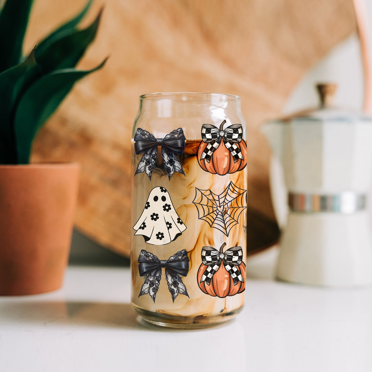 Meet the tumbler that proves Halloween can be both spooky AND stylish! This 20oz glass masterpiece features checkered bows on pumpkins, delicate lace bows, spiderwebs, and a fashionably floral ghost - because haunting season should always be runway-ready!